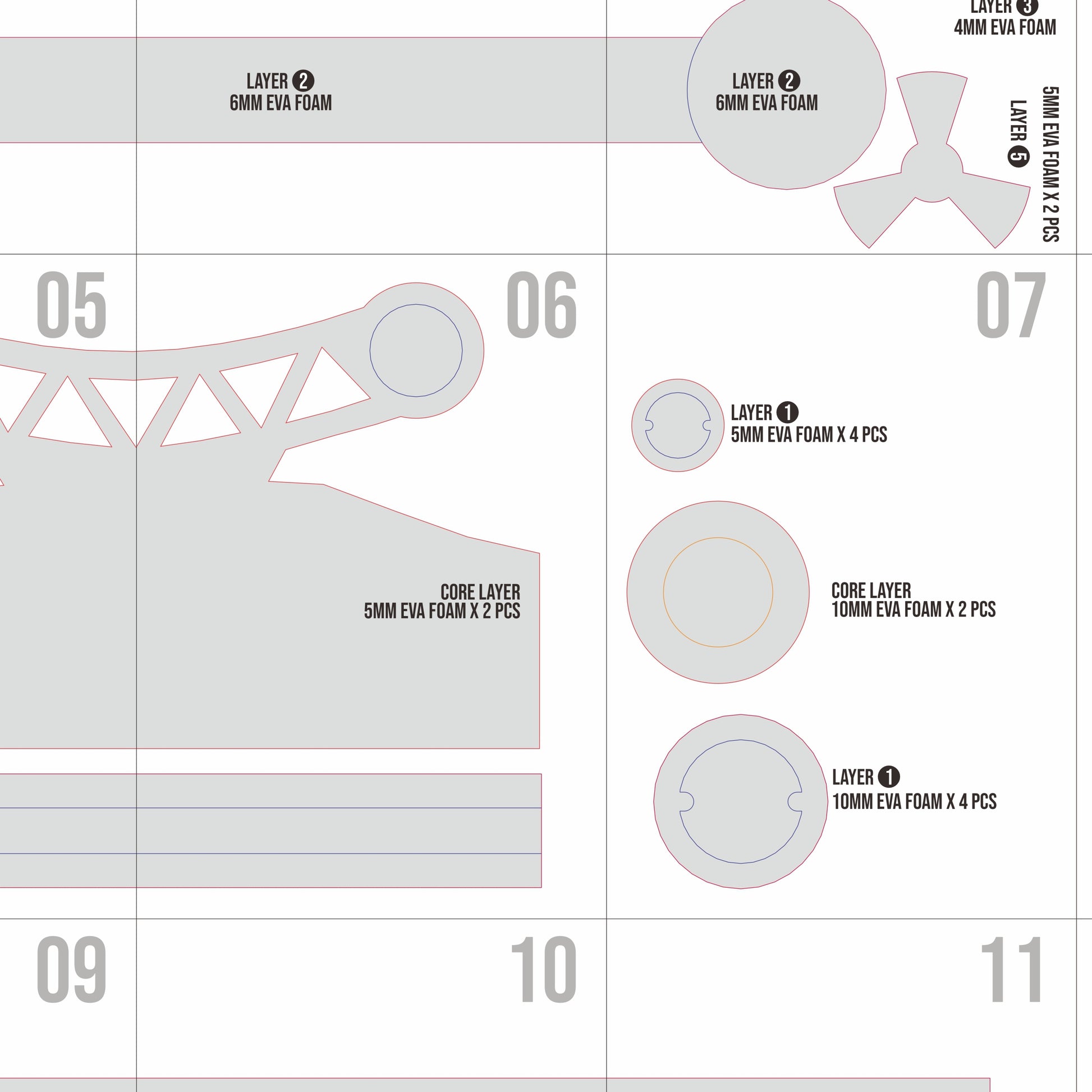 This template uses part-based layout guidance rather than step-by-step instructions, allowing flexibility for builders while remaining approachable for intermediate foam crafters.