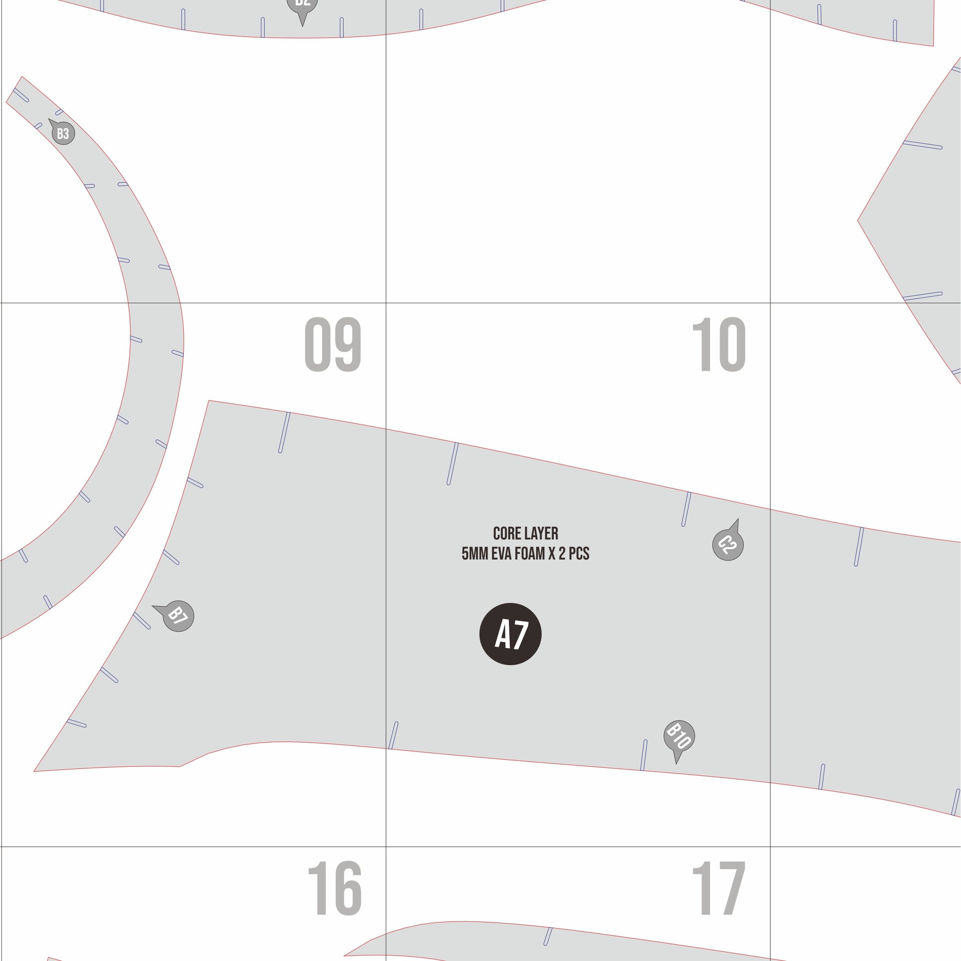 This template uses part-based layout guidance rather than step-by-step instructions, allowing flexibility for creators while remaining approachable for intermediate foam crafters.