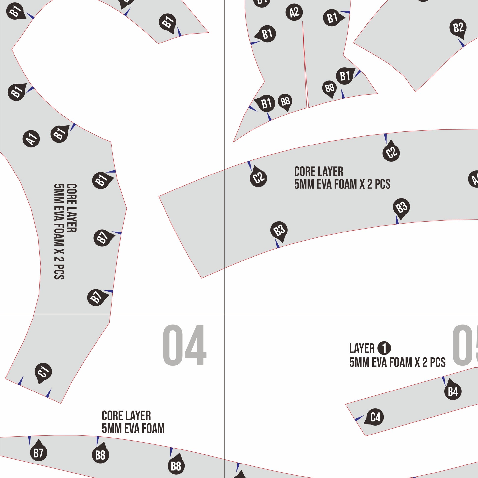 This template uses part-based layout guidance rather than step-by-step instructions, giving flexibility for creators while remaining approachable for intermediate foam crafters.