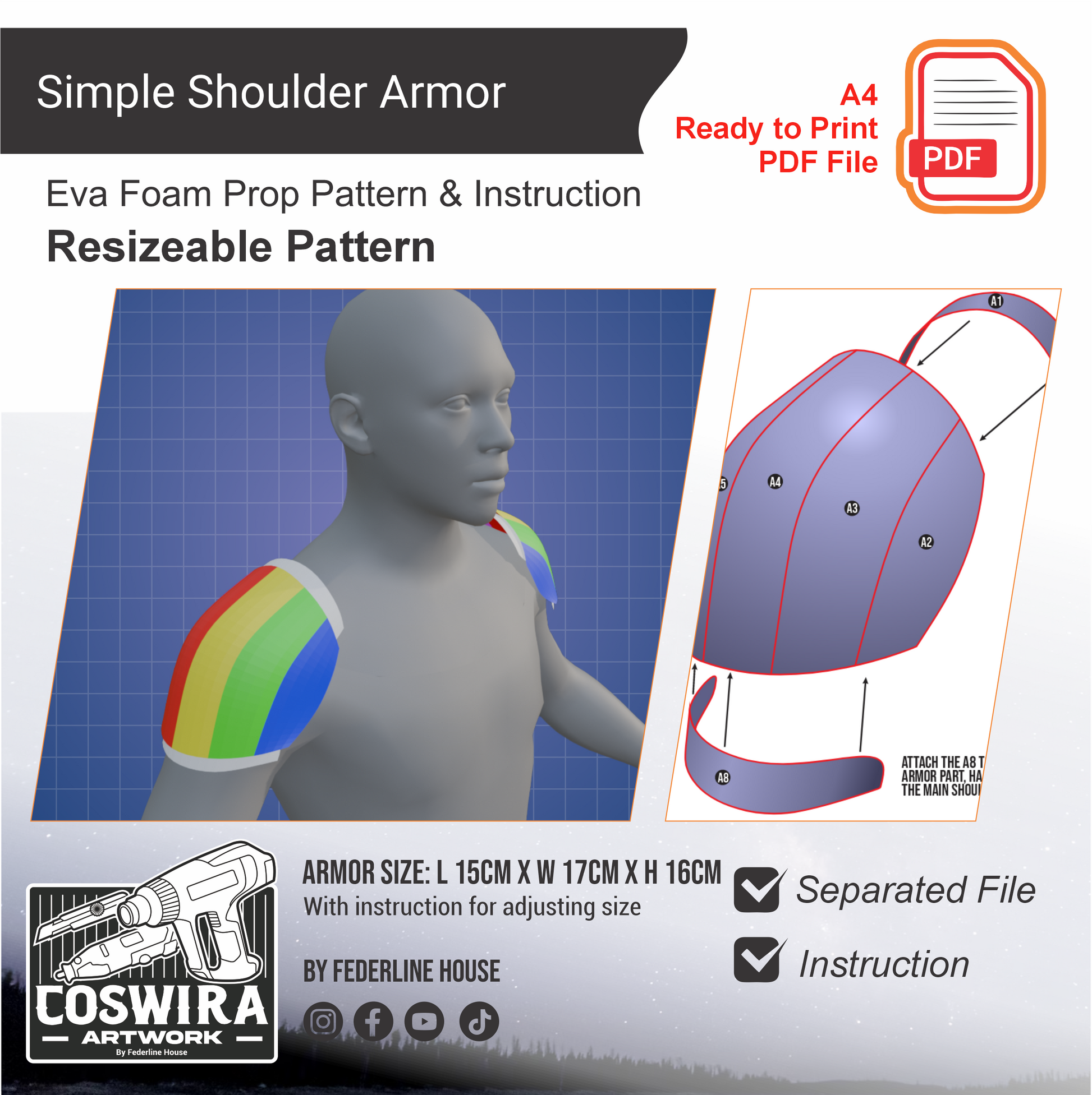 Build lightweight and versatile shoulder armor using this Simple Shoulder Armor Basic Pattern. Designed as a clean foundation, this template is ideal for a wide range of cosplay projects, fantasy characters, armor sets, and original costume designs that require a simple and functional shoulder silhouette.